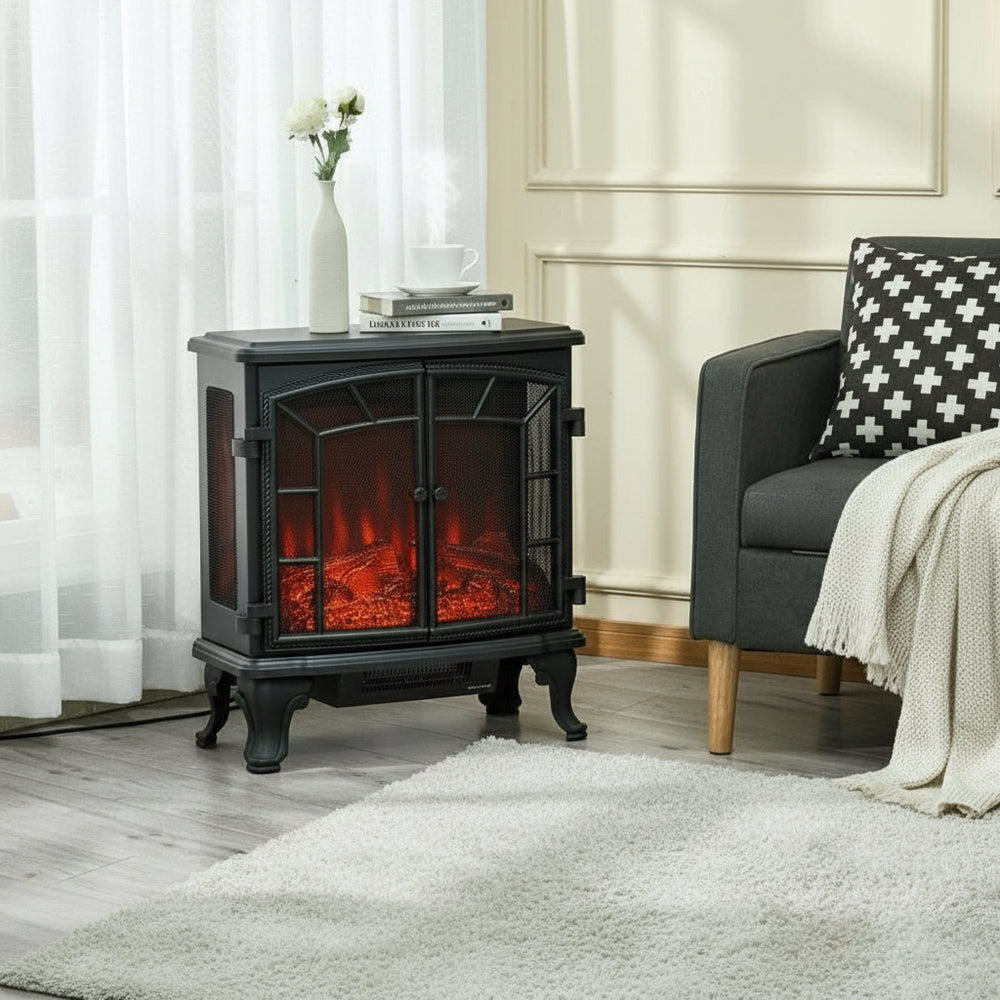 Black Remote Controlled Electric Fireplace Heater Realistic LED Flames and Logs